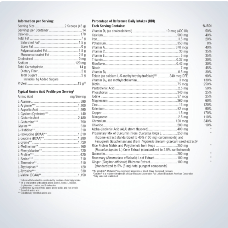 § Contributed by pea protein, added amino acids, and rice protein