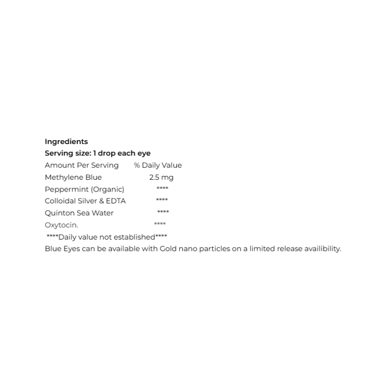 Blue Eyes Drops is a unique formula to support eye health. A powerful mitochondrial boosting blend of Methylene Blue along with Silver for photo biomodulation effects.