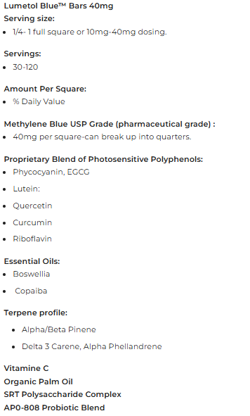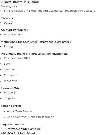 Lumetol Blue™ Bars contain 180mg of Methylene Blue and a variety of polyphenols that have photoactive properties. Lumetol Blue™ Bars are to be taken orally. They are NOT a troche and are taken by placing it in the back of the mouth and drinking it down with a liquid so as not to have a blue mouth.