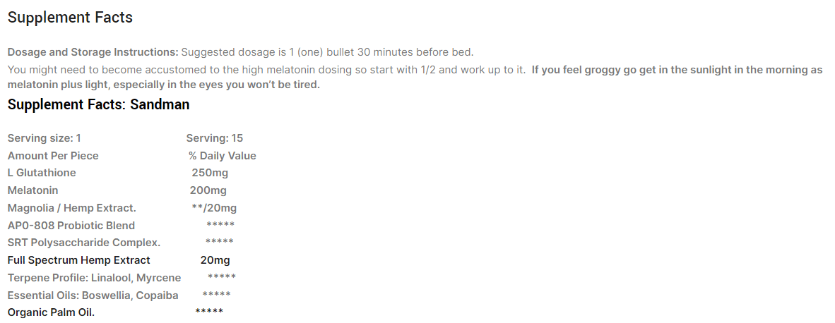 SandManâ„¢contains 250mg of glutathione, 200mg of Melatonin, Terpenes, Proprietary blend of SandMan Complexâ„¢ along with our proprietary AP0-808â„¢ probiotic strain.