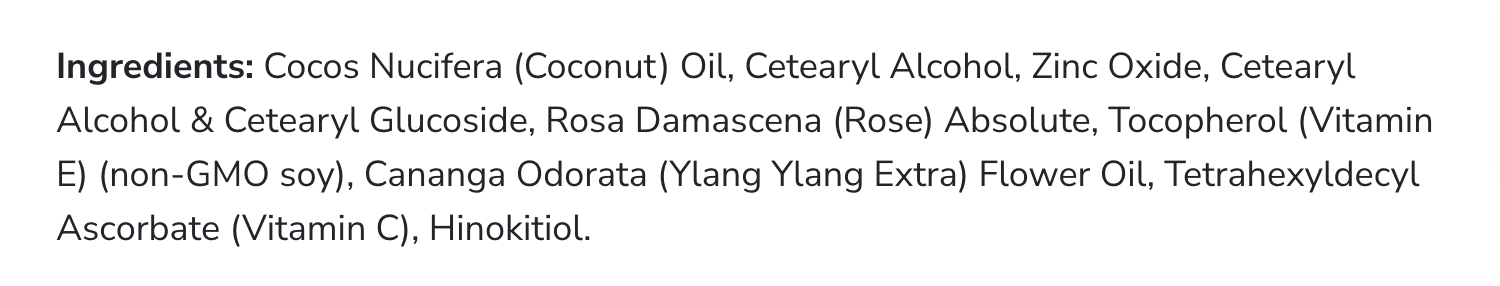 Ingredients:Â Cocos Nucifera (Coconut) Oil, Cetearyl Alcohol, Zinc Oxide, Cetearyl Alcohol & Cetearyl Glucoside, Rosa Damascena (Rose) Absolute, Tocopherol (Vitamin E) (non-GMO soy), Cananga Odorata (Ylang Ylang Extra) Flower Oil, Tetrahexyldecyl Ascorbate (Vitamin C), Hinokitiol.