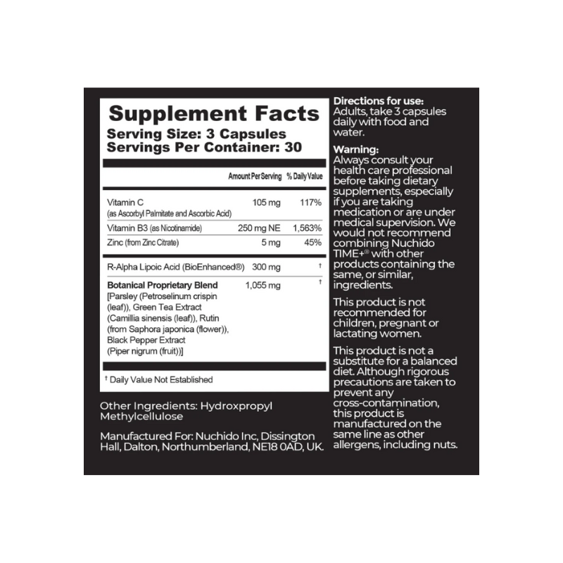 Nuchido TIME+â„¢ is a food supplement containing a scientific blend of vitamins, botanicals, and other supportive ingredients.