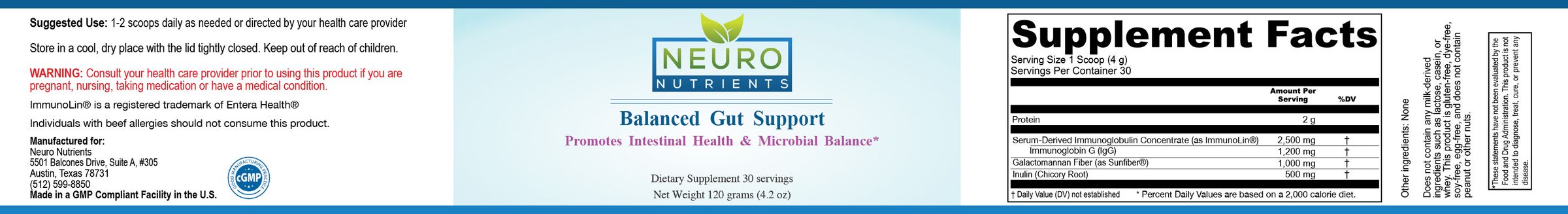 A healthy gut, or microbiome, is essential for balancing nearly every aspect of health, including immunity, nervous system function, inflammation control, and how our children grow and develop. As we are exposed to too much inflammatory bacteria, fungi, and other immune stressors (such as food or toxic food components our immune systems negatively react to), or we are not exposed to enough prebiotic food fiber that help our beneficial gut bacteria grow, our microbiome can fall out of health promoting homeostasis. Balanced Gut Support was designed to support these common causes of an imbalanced microbiome, providing a synergistic blend of patented ingredients including the worlds leading immunoglobulin source (ImmunoLin®) and prebiotic fibers (Sunfiber® and inulin from chicory root).