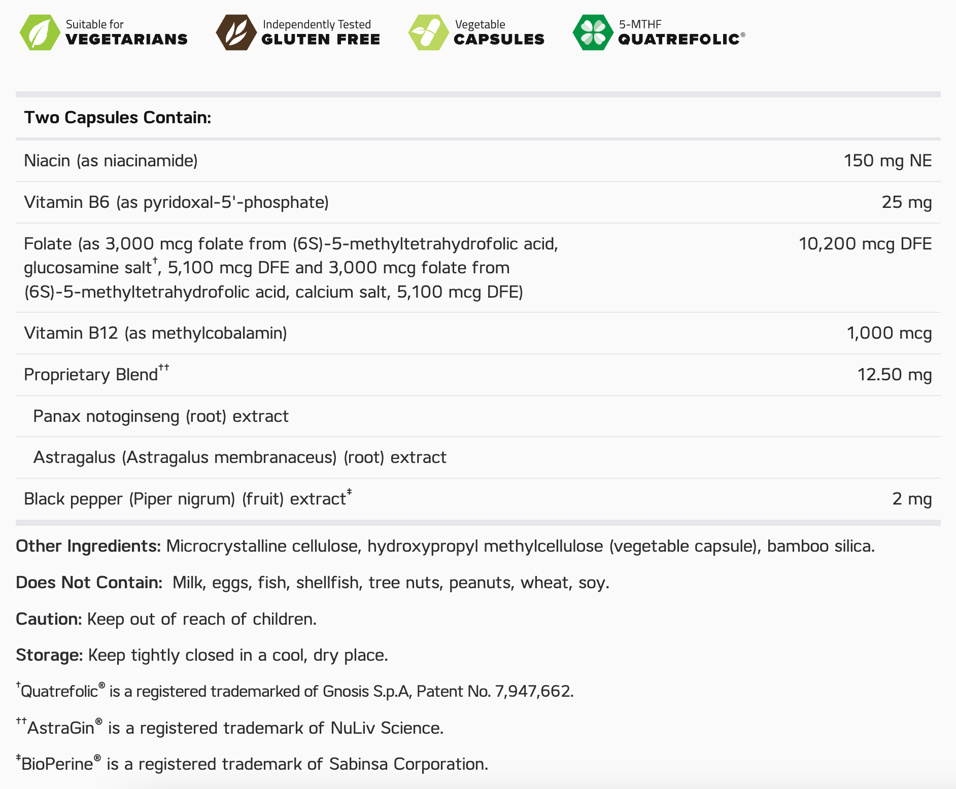 Methyl Folate™ Optimizer is a comprehensive formula designed to support optimal methylation and homocysteine levels.* The 5-MTHF in this formula – Quatrefolic® – is the most biologically active form of folate, allowing rapid uptake into the bloodstream.* Vitamin B12 is also provided in its active form, methylcobalamin, to further support methylation and healthy homocysteine levels.* NuMedica® has included its Enhanced Absorption Technology™ – a proprietary blend of AstraGin® and BioPerine®.* Clinical studies have shown the components of this proprietary blend to increase folate absorption by up to 50.4%.*