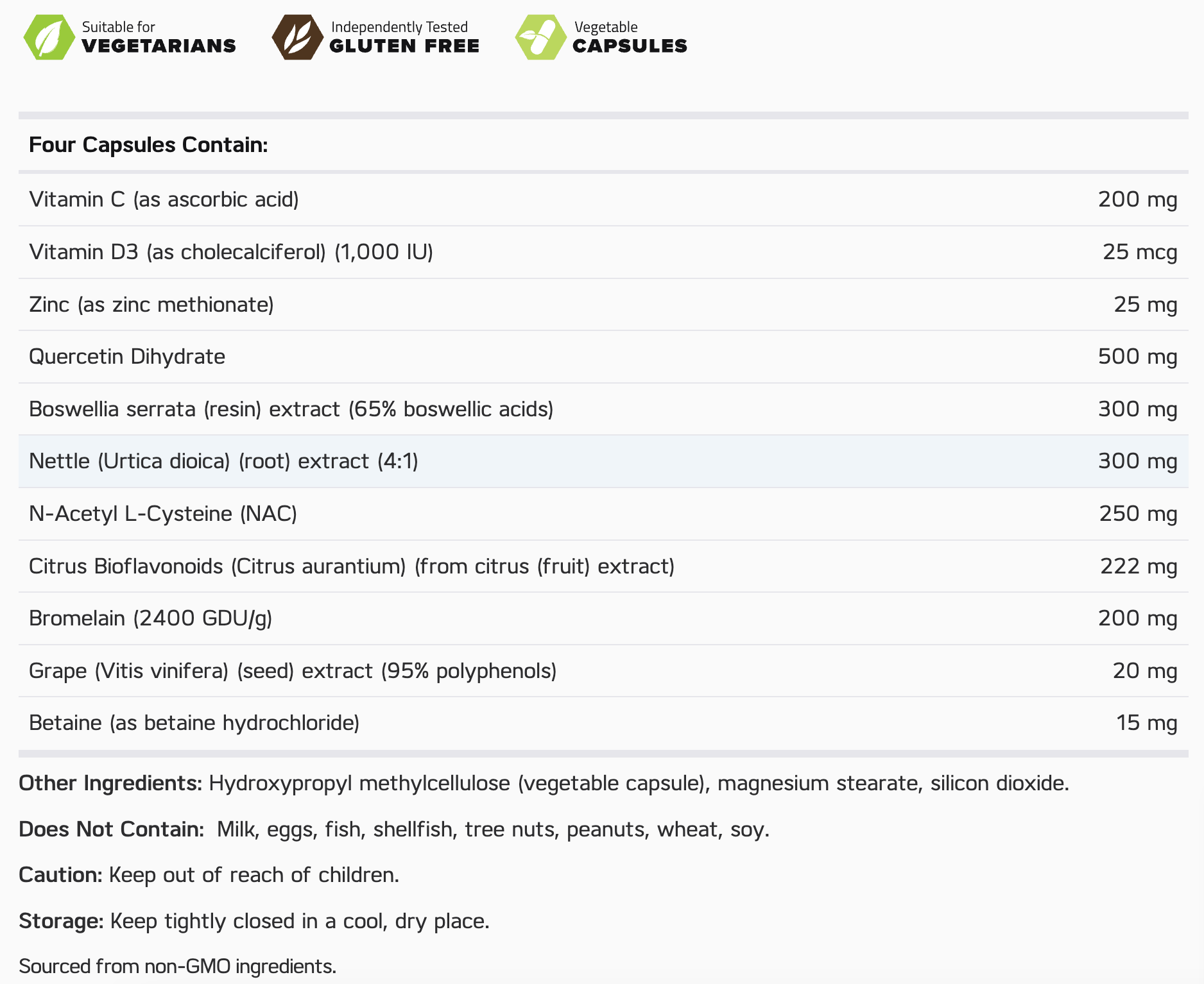 Key ingredients in Seasonal Shield® include Quercetin, Bromelain and Nettle extract, which have been found to help promote healthy mucus viscosity and provide histamine support. Additionally, N-Acetyl L-Cysteine (NAC) is a unique form of the amino acid l-cysteine, which has been found to support healthy tissue levels of glutathione (GSH).