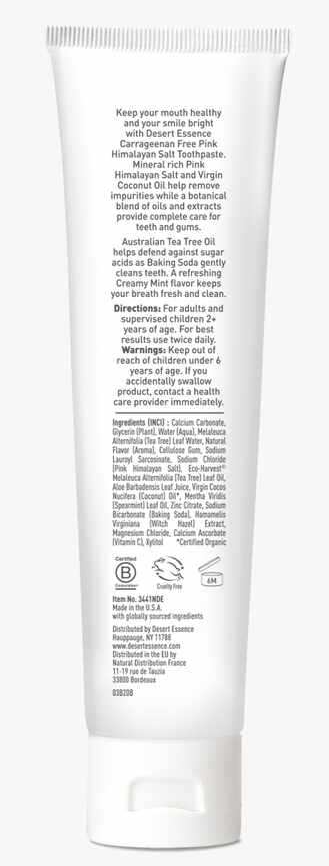 Plant-based and mineral-rich, this toothpaste is purely fluoride- and carrageenan-free. Pink Himalayan Salt—which contains 84 trace minerals—helps support healthy teeth and gums. Organic Coconut Oil helps draw out impurities, while Baking Soda, Zinc Citrate and Australian Eco-Harvest® Tea Tree Oil help to fight buildup and cavity-forming sugar acids. Leaves breath fresh with a Creamy Mint flavor.