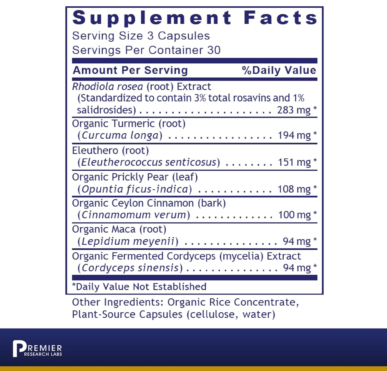 - Effective Dosage: Each 3-capsule serving contains Rhodiola rosea extract (283 mg), organic turmeric (194 mg), and eleuthero root (151 mg), among other ingredients