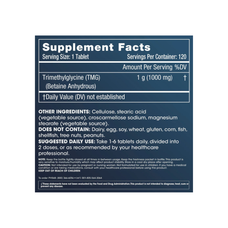 Trimethylglycine (TMG), also known as betaine anhydrous, is an amino acid that supports the body's methylation processes.