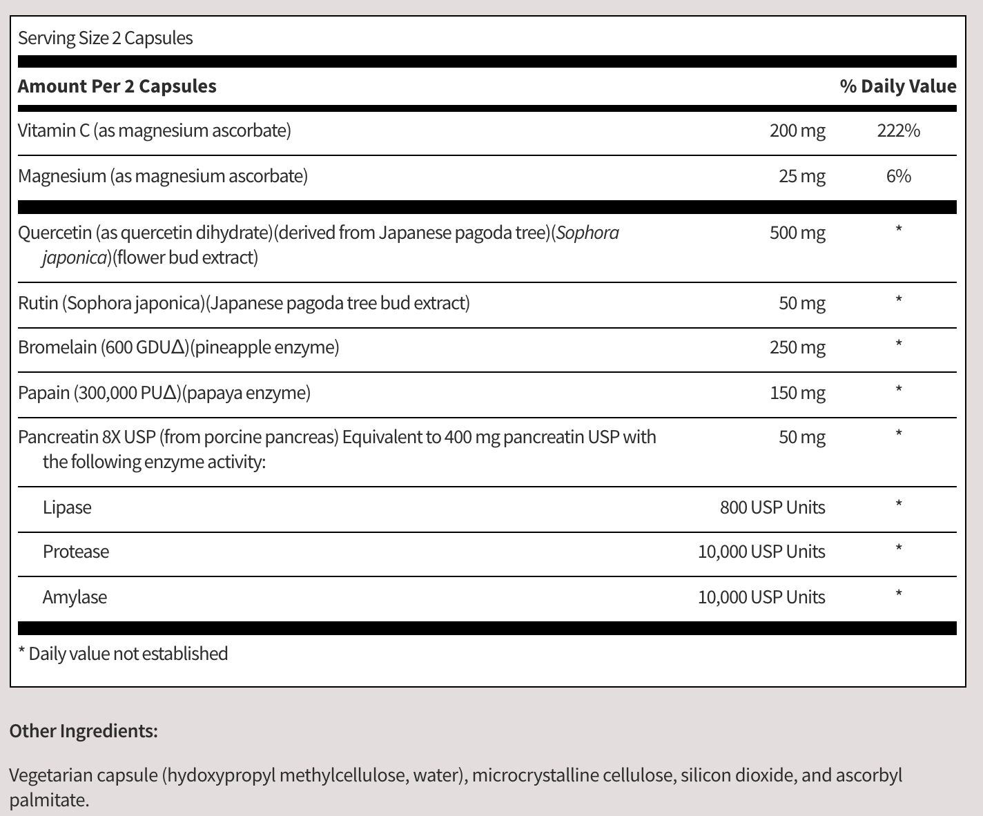 Quercetin-Bromelain Forté™ provides a mixture of proteolytic enzymes and bioflavonoids that help regulate the immune cytokine response.† Quercetin is a powerful bioflavonoid that protects cells and tissues against free radicals.† Bromelain, papain, and pancreatin provide a mixture of protein-specific and other enzymes that help ensure proper breakdown of protein molecules that may otherwise cause irritation.† Vitamin C, buffered with magnesium to eliminate acidity, supports histamine metabolism, detoxification processes, and collagen synthesis.
