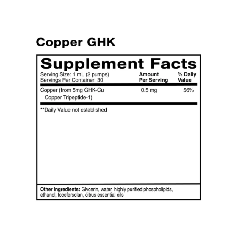 Copper GHK is an oral liposomal copper tripeptide complex, GHK-Cu, designed to help replenish endogenous GHK-Cu to more youthful levels. GHK is a naturally occurring bioactive amino that forms an ionic complex with copper in human plasma. As we age, normal levels of GHK-Cu decrease. It is thought that lower levels influence impaired wound healing and immune dysfunction among other age-related declines.
