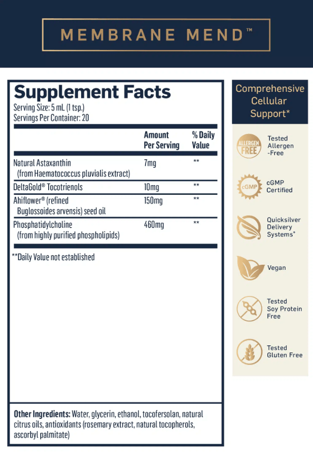 - Support Cellular Longevity - Potentially harmful inflammatory activity - a hallmark of aging - happens within our cells, too. The powerful antioxidant effects of astaxanthin, vitamin E, and fatty acids in Membrane Mend work fluidly to help balance inflammation at a cellular level.