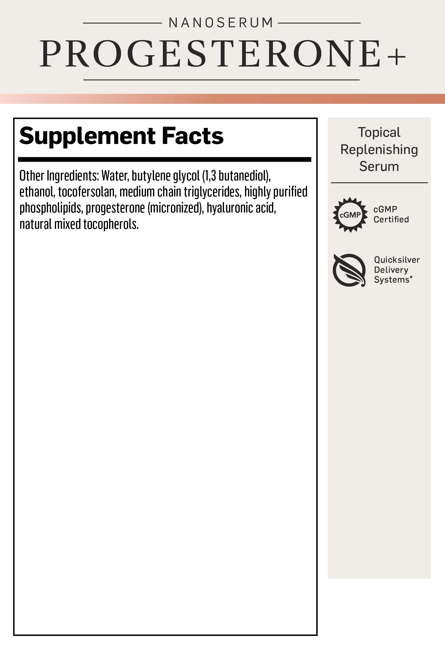 Peace Progesterone is a topical serum providing 8 mg of bioidentical progesterone per 2 pumps. Derived from the plant sterol diosgenin, Peace Progesterone is delivered using Quicksilver Scientific's proprietary lipid nanoemulsion technology for enhanced absorption of ingredients.