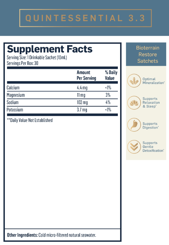 100% pure seawater, with up to 78 minerals & trace elements. Ideal for fast-acting hydration and mineral replenishment. Use when an immediate revitalizing effect is desired or to support exertion from physical or psychological effort. *
