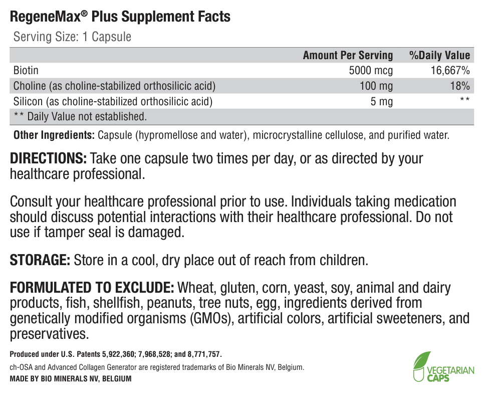 RegeneMax® Plus features clinically tested ch-OSA® (choline-stabilized orthosilicic acid) complemented with biotin. ch-OSA naturally helps nourish your body’s beauty proteins by supporting and activating enzymes used by collagen-generating cells to make collagen. Regular orthosilicic acid (OSA) has to be stabilized to avoid polymerization, a process that decreases bioavailability. ch-OSA’s patented choline-stabilization technology prevents polymers from forming and ensures OSA’s optimal absorption. By combining ch-OSA with biotin, RegeneMax Plus offers an even greater level of beauty support.*