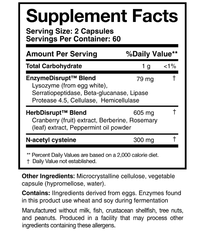 - Enzymes & N Acetyl Cysteine - Includes NAC and EnzymeDisrupt Blend with Lysozyme (from egg white), serratiopeptidase, beta-glucanase, cellulase, hemicellulase, and a lipase protease protease enzyme supplement.