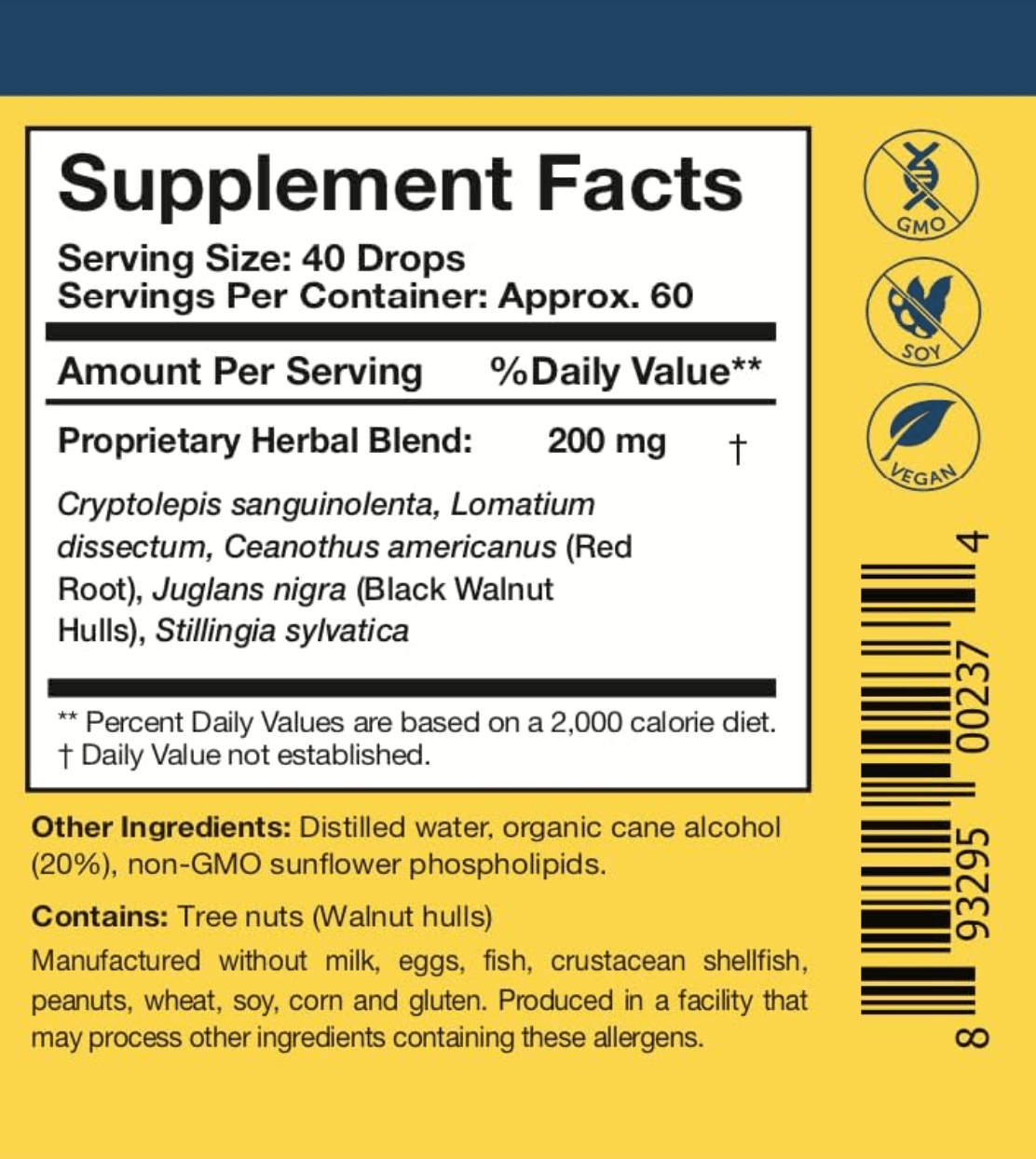 - Vegan & GMO-free. Manufactured without milk, eggs, fish, crustacean shellfish, peanuts, wheat, soy, corn and gluten. Produced in a facility that may process other ingredients containing these allergens. Contains: Tree nuts (black walnut hull tincture).