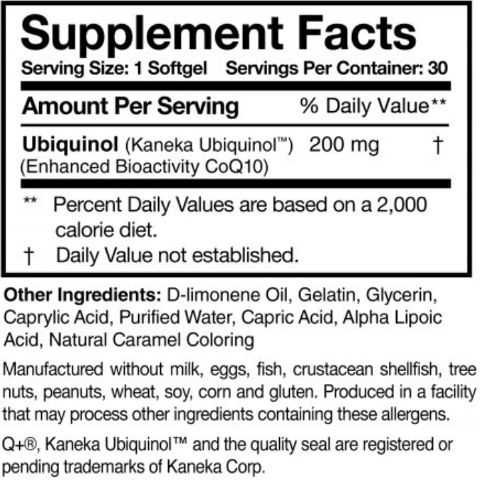 Ubiquinol Super 200â„¢ offers the patient 200 mg of the reduced form of CoQ10 for its primary antioxidant role. As people age, CoQ10 becomes more difficult to absorb. This reduced form of CoQ10 improves absorption, offering an option for those seeking the benefits of CoQ10 in the ubiquinol form.