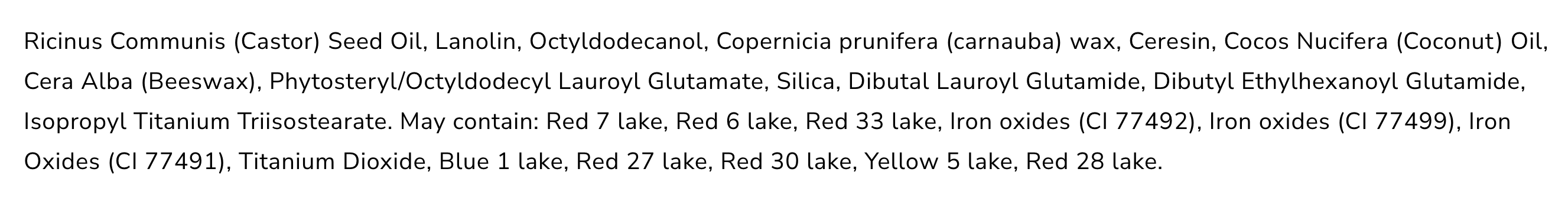 Ricinus Communis (Castor) Seed Oil, Lanolin, Octyldodecanol, Copernicia prunifera (carnauba) wax, Ceresin, Cocos Nucifera (Coconut) Oil, Cera Alba (Beeswax), Phytosteryl/Octyldodecyl Lauroyl Glutamate, Silica, Dibutal Lauroyl Glutamide, Dibutyl Ethylhexanoyl Glutamide, Isopropyl Titanium Triisostearate. May contain: Red 7 lake, Red 6 lake, Red 33 lake, Iron oxides (CI 77492), Iron oxides (CI 77499), Iron Oxides (CI 77491), Titanium Dioxide, Blue 1 lake, Red 27 lake, Red 30 lake, Yellow 5 lake, Red 28 lake.