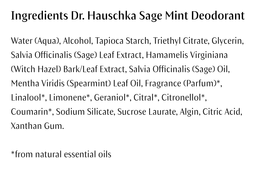A deodorant you can rely on: Our non-oily Sage Mint Deodorant helps prevent the formation of odors without constricting your pores or staining your clothes. This Dr. Hauschka roll-on deodorant works entirely without aluminum salts. Its natural herbal scent accompanies you subtly throughout the day.