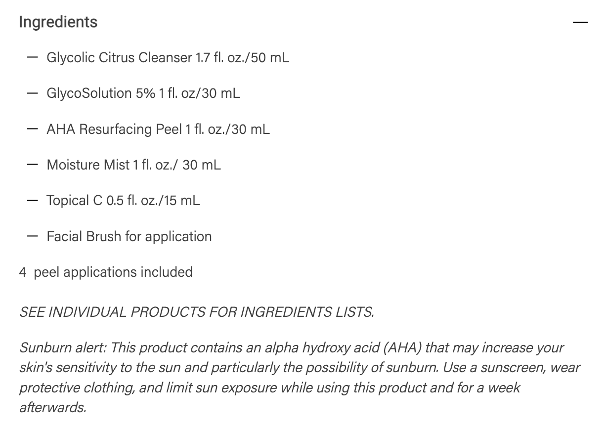 Includes: Glycolic Citrus Cleanser 1.7 fl. oz./50 mL · GlycoSolution 5% 1 fl. oz/30 mL · AHA Resurfacing Peel 1 fl. oz./30 mL · Moisture Mist 1 fl. oz./ 30 mL · Topical C 0.5 fl. oz./15 mL · Facial Brush for application