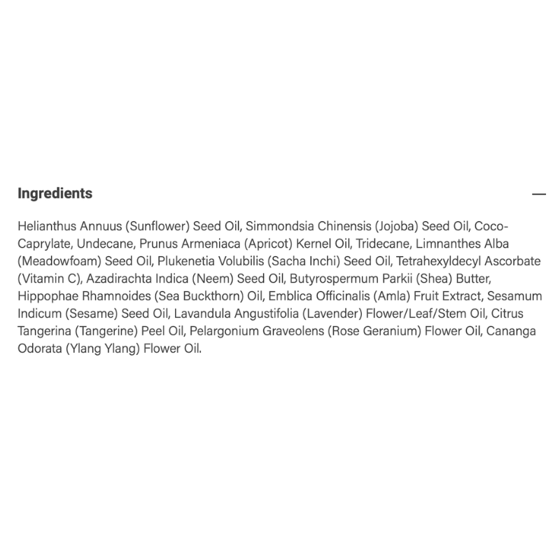 Meadowfoam + sacha inchi + jojoba + apricot kernel seed oils - rich in antioxidants and essential fatty acids, help replenish the skin barrier, nourish, hydrate and soften skin.*