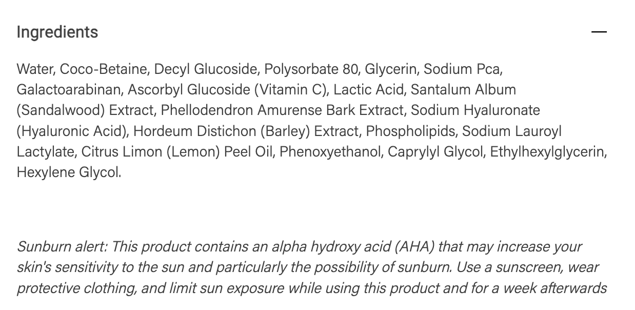 Regular cellular turnover means healthier, younger looking skin and consistent exfoliation is key to achieving it. A mild cleansing base, consisting of sugar derived glycerin and coconut oil fatty acids, houses lactic acid to gently remove the dead layer of skin and allow newer, natural and healthier skin to emerge. Then, a powerful blend of vitamin C and sodium PCA helps nurture, brighten and calm the appearance of skin. Finally, it drenches the skin in hyaluronic acid and vegan phospholipids to help replenish natural moisture and combat drying.