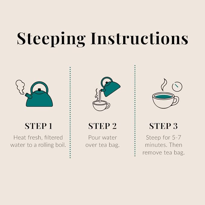 Steeping herbal tea is easy. Simply heat fresh, filtered water to a rolling boil. Then pour 6 oz of water over the tea bag and steep for 5-7 minutes.