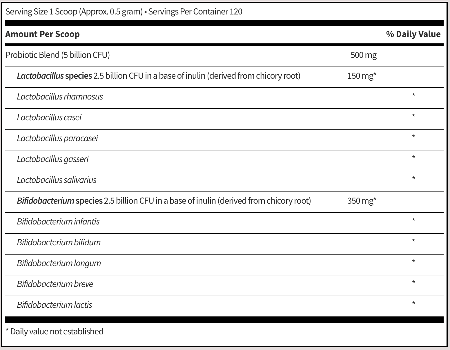 Each scoop (0.5 gram) provides 5 billion CFU. Safe gastrointestinal, metabolic, and immune support.