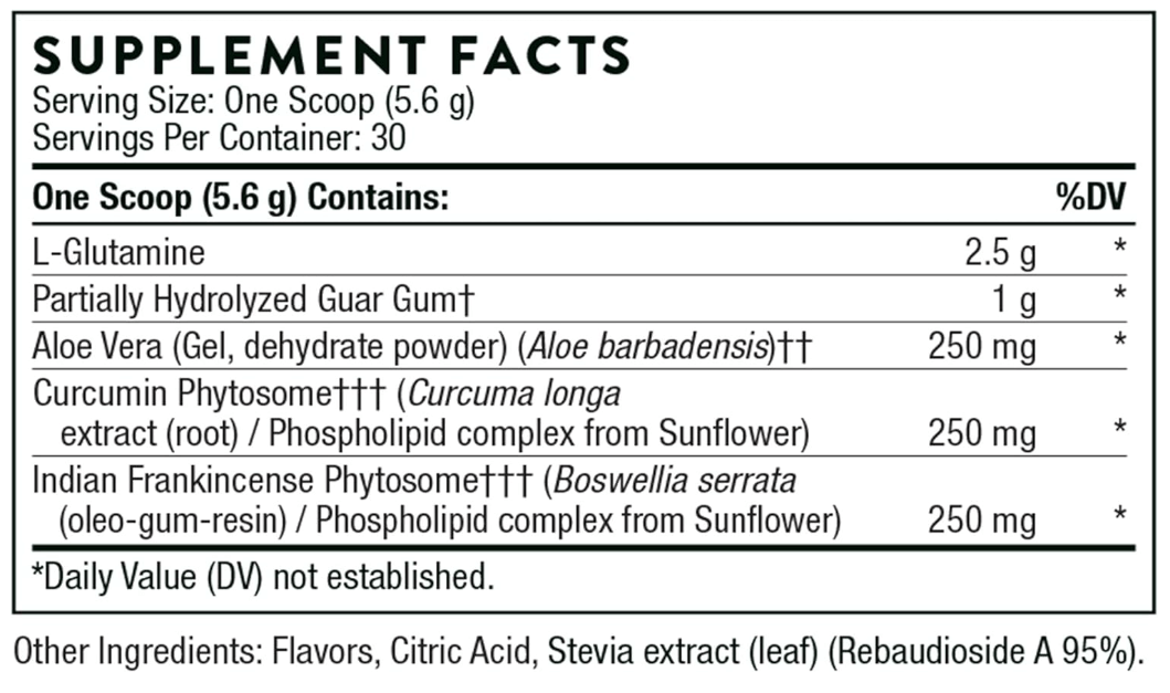 EnteroMend® combines the mucosa-protective effects of L-glutamine with highly absorbable botanical complexes to provide a unique amino acid/botanical formula that supports overall intestinal health.* Meriva® and Casperome® (curcumin and Boswellia phytosomes for enhanced absorption) help maintain a healthy inflammatory response in the GI tract.* DaltonMax 700®, a unique aloe extract with 200:1-potency, soothes intestinal mucus membranes.* Sunfiber® promotes healthy gut flora, normal butyrate levels, and bowel regularity.* L-glutamine is present to decrease intestinal permeability.* EnteroMend is a great-tasting orange-vanilla flavored powder and is easy to mix in water or a beverage of choice.