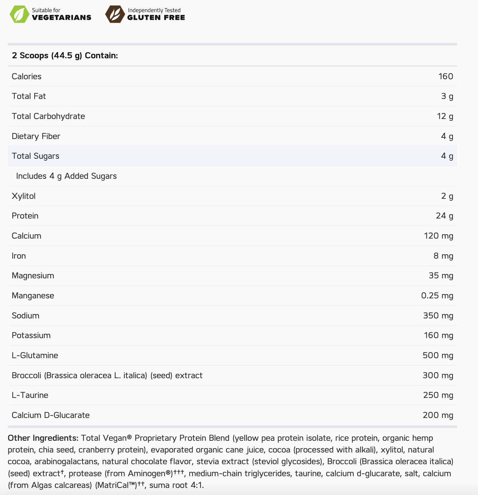 Total Vegan® is a revolutionary plant protein blend featuring 5 well-tolerated, vegan protein sources – yellow pea, rice, hemp, chia and cranberry – to provide a well-balanced amino acid profile in a high protein formula. In addition to the well-rounded protein profile, Total Vegan® features many unique ingredients to support the immune system, the digestive system, body composition, bone health and detoxification.* Pea and rice protein provide a branch chain amino acid profile that is comparable to whey protein, providing high amounts of cysteine, lysine and methionine. This formula contains three additional protein sources, each with unique properties: organic hemp protein, featuring edestin that can stimulate antibody production; chia protein, which is desired by athletes for its endurance boosting properties and promotes hydration and a sense of fullness; and cranberry fruit protein, which has urinary tract and antioxidant benefits.* L-glutamine and l-taurine are added to Total Vegan® to support an increase in lean muscle mass.* Total Vegan® contains Aminogen®, a patented plant-derived enzyme blend, which helps the body break down and absorb more amino acids from protein.* It is clinically proven to release 100% more plasma amino acids, 250% more branched-chain amino acids and boost nitrogen retention by 32%.*