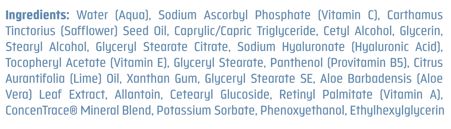 Formulated with Vitamin C and ionic minerals from ConcenTrace®, this Vitamin C Hyaluronic Acid Serum helps hydrate, firm and beautify the skin. With Vitamins E and A, and Aloe to help soothe and protect skin against environmental exposure.