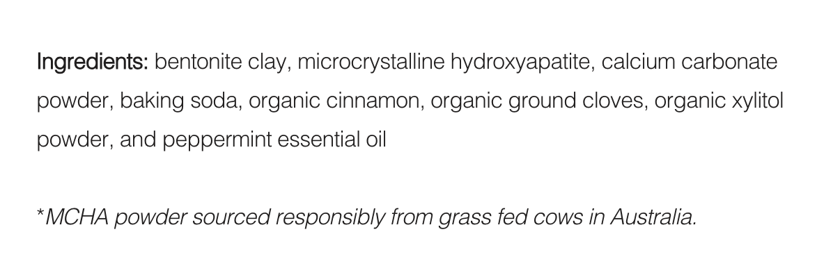Ingredients: bentonite clay, microcrystalline hydroxyapatite, calcium carbonate powder, baking soda, organic cinnamon, organic ground cloves, organic xylitol powder, and peppermint essential oil *mcha powder sourced responsibly from grass fed cows in australia.Â