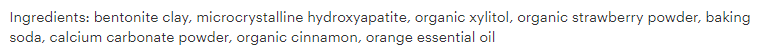 Ingredients: bentonite clay, microcrystalline hydroxyapatite, calcium carbonate powder, coconut charcoal, baking soda, organic cinnamon, organic ground cloves, organic xylitol powder, and organic orange essential oil