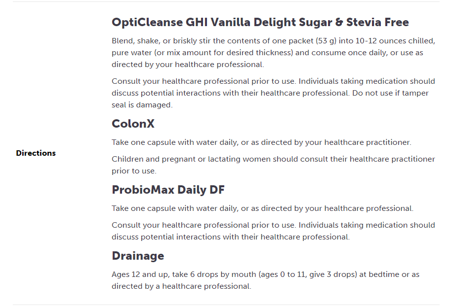 6 Day Detox Micro Kit includes 10 single serving packets of OptiCleanse GHI Vanilla Delight Sugar-& Stevia-Free‡, 1 bottle of ColonX 60c, 1 carton of ProbioMax Daily DF 30c, and 1 bottle of Drainage 1 fl oz.