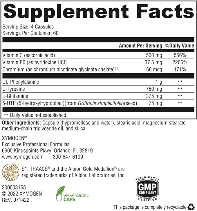 Appe-Curb™ contains key amino acids to support the biosynthesis of neurotransmitters involved in appetite control, carbohydrate or fat cravings, and mood. Chromium is present to support healthy glucose metabolism and support food intake regulation.*