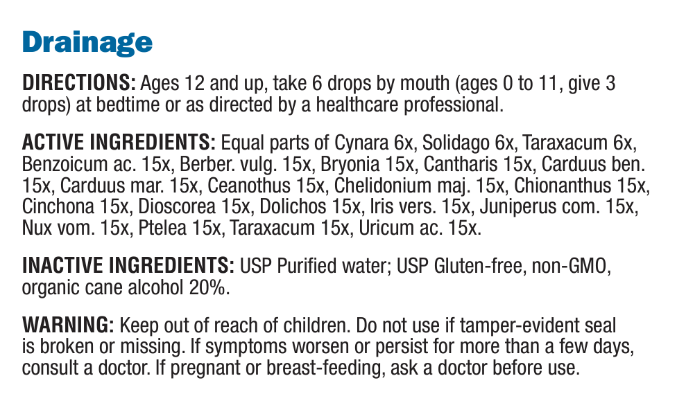 Drainage combines homeopathic liver “drainers†with homeopathic remedies that are known to support excretory function. Drainage focuses on the liver, kidney, and colon functions while addressing symptoms associated with toxicity.