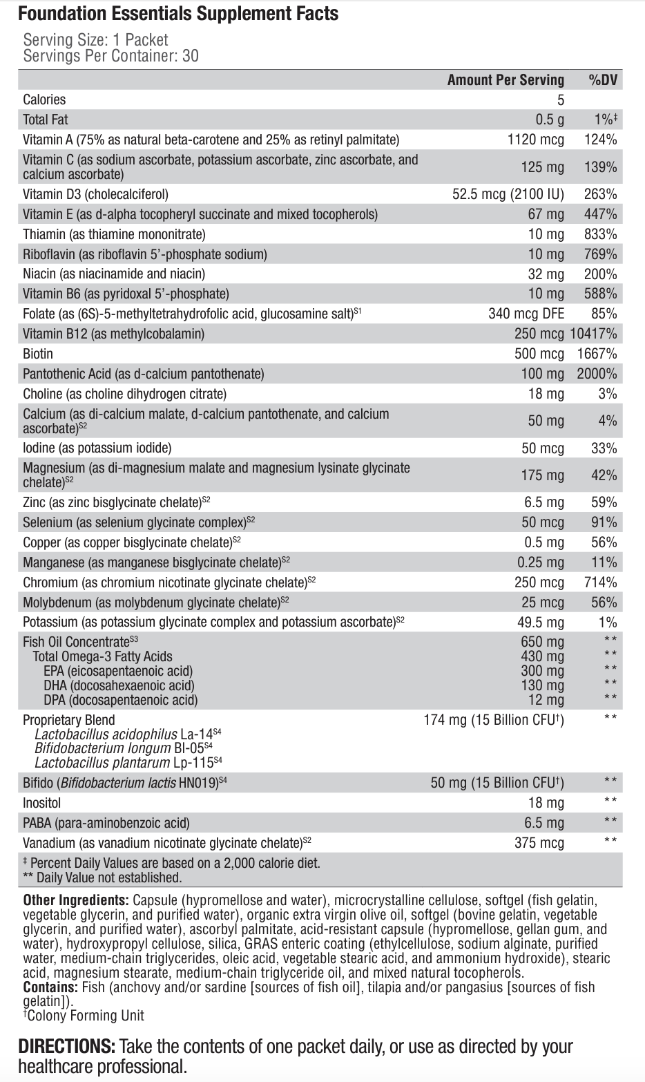Foundation Essentials provides 30 days of supplementation in convenient, once-a-day packets. Each packet provides a daily dose of five XYMOGEN foundational health formulas: ProbioMax® Daily DF, ActivNutrients® without Iron, Omega MonoPure® 650 EC, OptiMag® 125, and D3 2000. These formulas provide high-potency probiotics, an iron-free multiple, IFOS five-star certified omega-3 fatty acids, and extra magnesium and D3. Foundation Essentials can be used for any number of purposes, such as to serve as a kick start to your MedPax® program, basic supplementation while you wait for lab results, or a convenient way to supplement while traveling.*