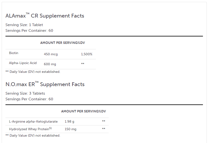 Each packet contains: 1 ALAmax CR tablet, 3 N.O.max ER tablets, 1 Resveratin Plus capsule.