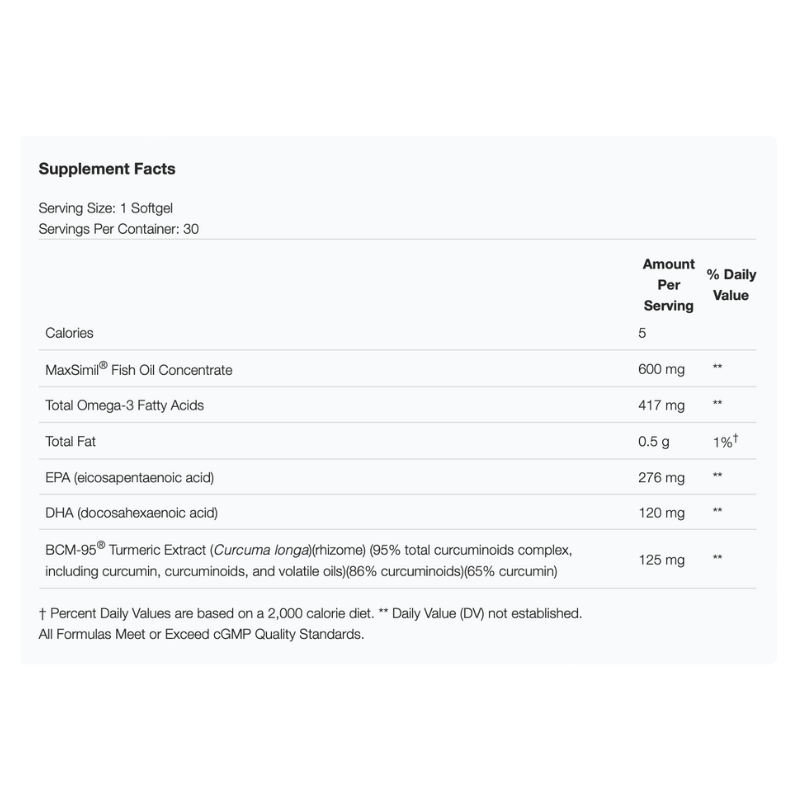 Omega MonoPure® Curcumin EC features complementary ingredients to help promote cellular health and modulate the production of cytokines. MaxSimil® highly absorbable monoglyceride fish oil is International Fish Oil Standards (IFOS) five-star certified. BCM-95® is an optimally absorbed turmeric extract composed of a 95% standardized curcuminoid-essential oil complex.