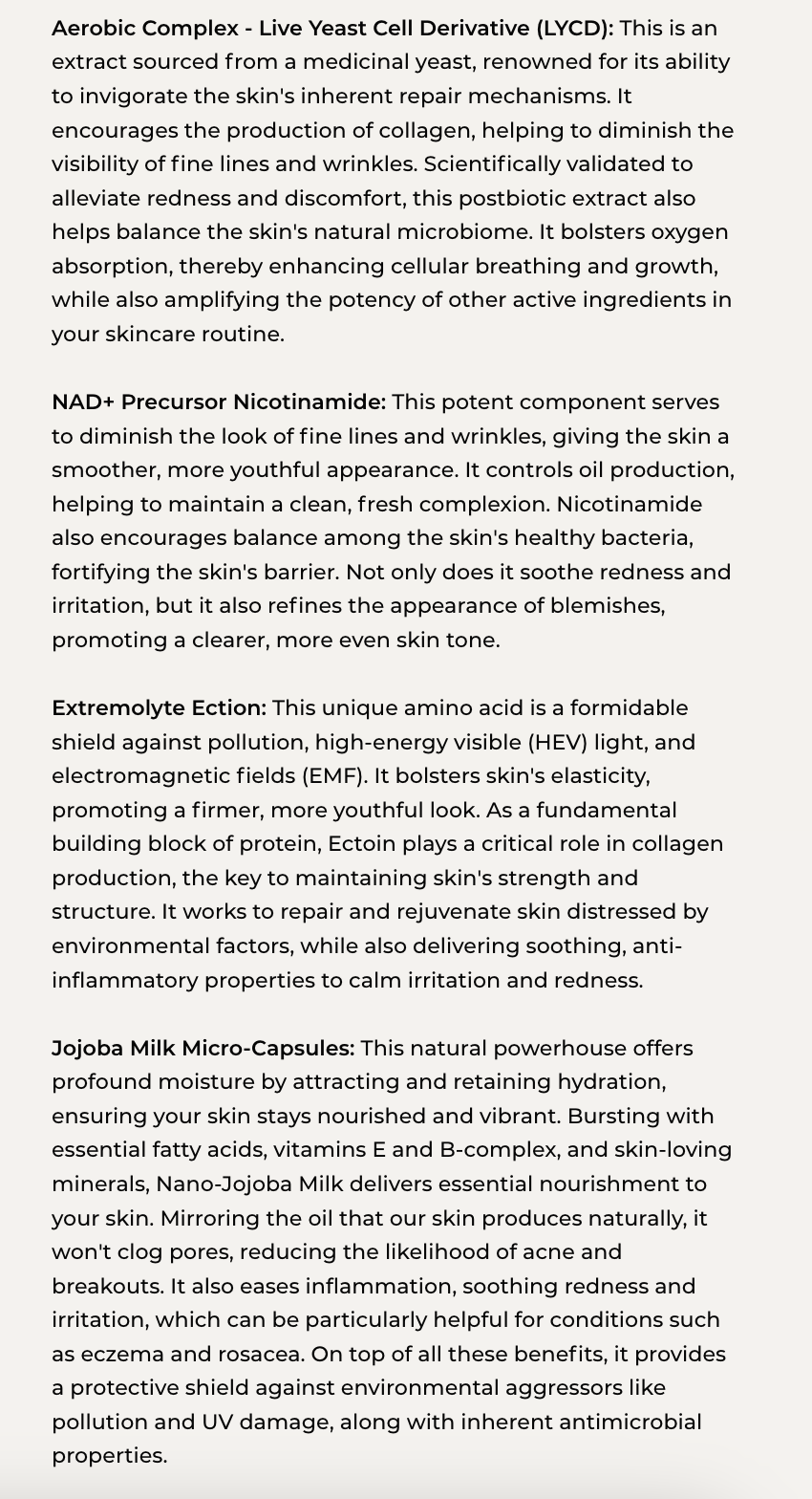 A nutrient-rich, lightweight essence that boosts cellular activities for youthful skin function and appearance. Prepares skin for optimal absorption & utilization of the products that follow. Loads skin cells with oxygen, provides NAD+ and ATP production support, fortifies skin barrier, improves skin microbiome & hydrates.